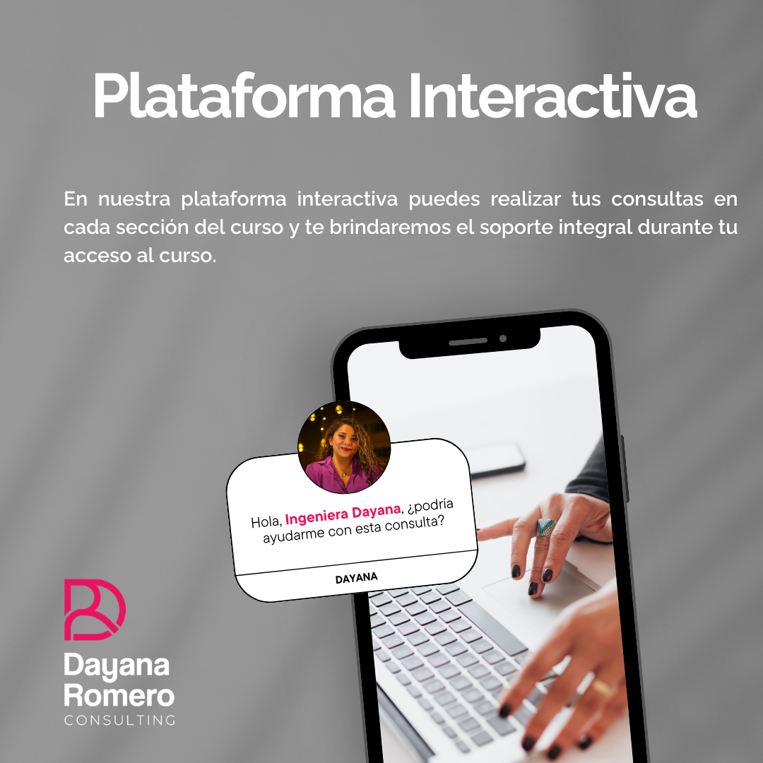 Aprovecha nuestra plataforma interactiva exclusiva. Dentro de nuestro curso, no solo adquieres conocimientos, sino que también obtienes un valioso acceso a una plataforma interactiva donde puedes dejar todas tus dudas y consultas. Imagina tener la oportunidad de plantear tus inquietudes directamente a la Ingeniera Dayana, la creadora del curso, quien estará ahí para proporcionarte respuestas claras y precisas. Esta plataforma no solo te brinda la tranquilidad de contar con un soporte directo y personalizado, sino que también te permite aprovechar al máximo tu aprendizaje.